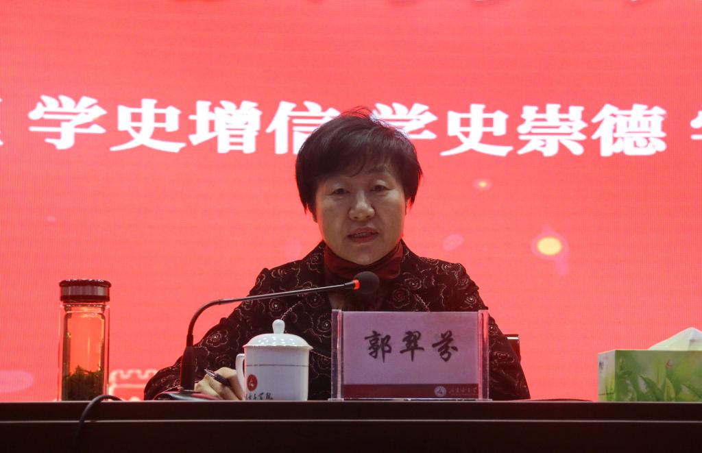 郭翠芬强调,要立足工作实际,扎实推进党史学习教育高质量开展,做到规定动作落实到位不走样,自选动作特色鲜明有深度。一要加强政治引领,坚决做到“两个维护”;二要强化理论武装,感悟思想伟力;三要突出师生群体,拓展学习教育覆盖面;四要牢记初心使命,办好师生实事,开展联系师生“大走访”、师生难题“大排查”和服务师生“大提升”,真正为师生员工解难事、办实事、做好事,切实增强师生的获得感、幸福感、安全感;五要改作风提能力,积极担当作为。要加强组织领导,严格落实责任,坚持以上率下,创新方式方法,营造浓厚氛围,确保党史学习教育取得实效。