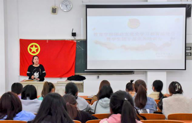 为贯彻落实学校青年学生党史学习教育方案及团学干部作风整顿提升工作实施方案,进一步提高团学干部的综合素质,4月22日下午,教育学院团总支在博学楼408举办党史学习教育推进会暨团学干部业务培训会,115名团学干部参加会议。