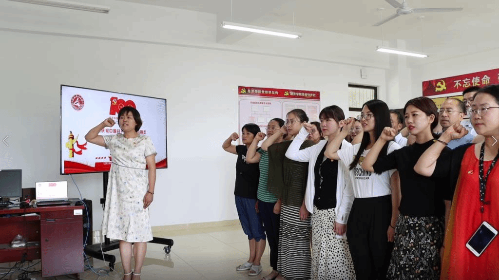 此次“唱红歌 明初心”庆祝活动由文艺演出和重温入党誓词两部分组成。活动伊始,经济学院全体老师心中澎湃着爱党爱国的热潮,口中唱响激昂的歌曲,以《没有共产党就没有新中国》和《团结就是力量》,抒发了自己对中国共产党百年丰功伟绩的崇敬与感恩,表达了自己在新征程中接续奋斗的自豪与决心。紧接着,经济学院党总支书记齐振花带领全体教师党员重温入党誓词,进一步坚定理想信念,牢记初心使命。最后,经济学院全体教师为党齐声合唱生日歌,共同庆祝党的生日。