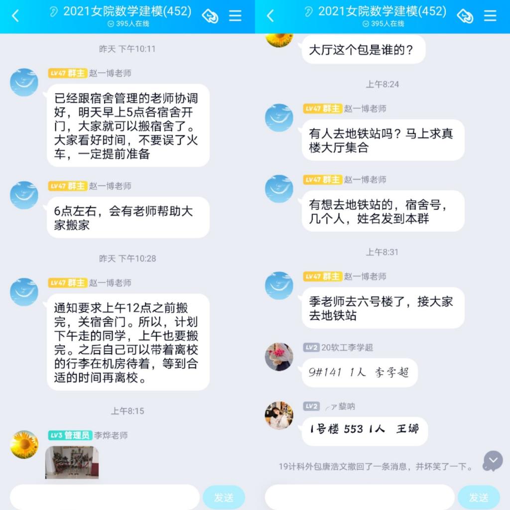 7月27日-29日,学院将机房模拟集训更改为线上,全体集训学生在宿舍参加,指导老师、辅导员老师冒雨走访学生宿舍,深入了解学生学习生活情况,摸排学生思想动态,传达台风期间注意事项,强调与学院保持紧密联系,遇到困难、问题要及时反馈。7月30日集训结束,学院积极与学生工作部(处)、后勤处协调沟通,为学生安全顺利离校做好充分准备。30日早晨6点,学院党员教师、辅导员老师自发开车来到求新楼下,帮助学生将行李搬运回公寓、送学生去地铁站乘车,经过近2个小时的努力,130余名同学顺利完成宿舍搬迁,临行之际老师们认真叮嘱大家要高度重视疫情防控,回家路上做好防护。参加集训同学们对学院党员教师的关心和帮助表示感谢,并表示将严守安全责任,利用集训和假期刻苦学习,不辜负学院和老师们的期望。